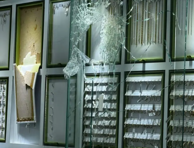 Enseguida se estacionaron frente a la joyería ubicada casi sobre la esquina con la calle Hidalgo. Uno de ellos bajo y entró al negocio, amagó a una pareja, empleados del lugar y con un objeto, al parecer un martillo, quebró los vidrios de varias vitrinas para tomar las joyas.