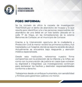 La Procuraduría de Protección de Niñas, Niños y Adolescentes fue notificada y asumió la tutela legal de la bebé, mientras que la Fiscalía General del Estado de Guanajuato ya inició una investigación para esclarecer las circunstancias del abandono y dar con la madre de la menor.