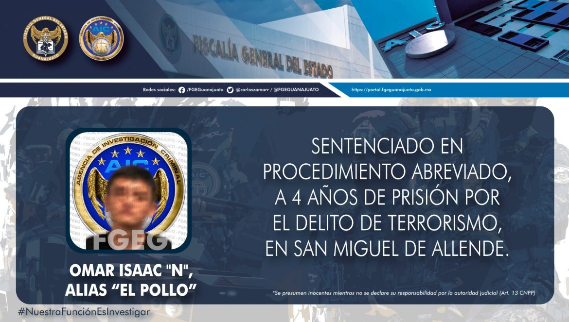 Tras haber sido vinculado a proceso penal por el delito de terrorismo, en agravio de la sociedad, OMAR ISSAC “N” alias “El Pollo”, aceptó ser responsable de los cargos que le acusa la Fiscalía, y se apegó a un procedimiento abreviado, dando por terminado su proceso penal, con una sentencia de 4 años de prisión.