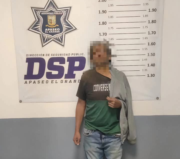 Apaso el Grande, Gto. (1/8/2025).- Elementos de la Policía Municipal, detuvieron a un hombre con comportamiento agresivo contra integrantes de su familia.