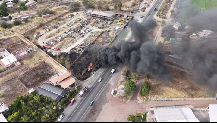 Salamanca, Gto. (14/1/2026).- Un fuerte incendio en un yonke ubicado a un costado de la carretera Federal 43, a la altura de la Tinaja, se generó la tarde de este martes, provocando una intensa movilización del personal de emergencias.