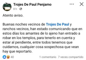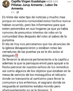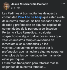 En redes sociales se difundieron mensajes a través de varias cuentas, en las que se denuncian los atracos de objetos sagrados y se llama a la ciudadanía a estar alertas y reportar cualquier acto o persona sospechosa.