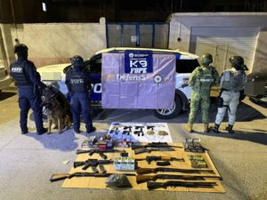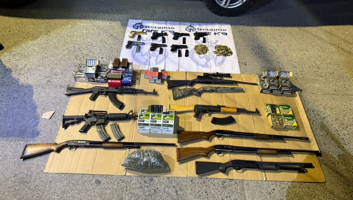 Salamanca, Gto. (8/1/2026).- Durante un operativo preventivo en una empresa de paquetería en Salamanca se aseguró armamento, municiones y presunta droga, entre ellos 15 armas que no llegarán a las calles de Guanajuato.