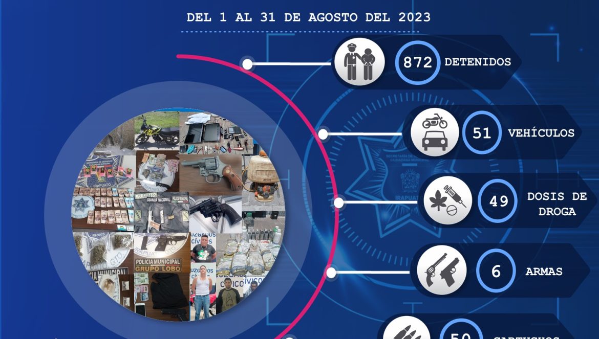 Irapuato, Gto. (06/09/2023).- Durante agosto se detectaron y aseguraron 6 armas de fuego, droga y otros objetos mediante acciones de prevención y dispositivos de control provisional.