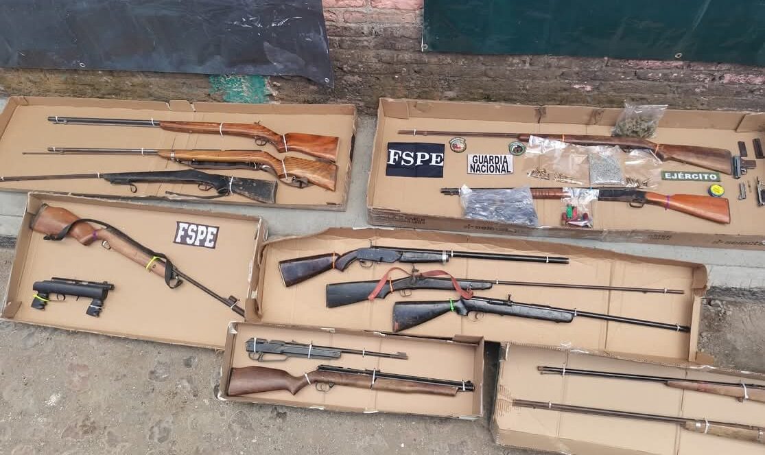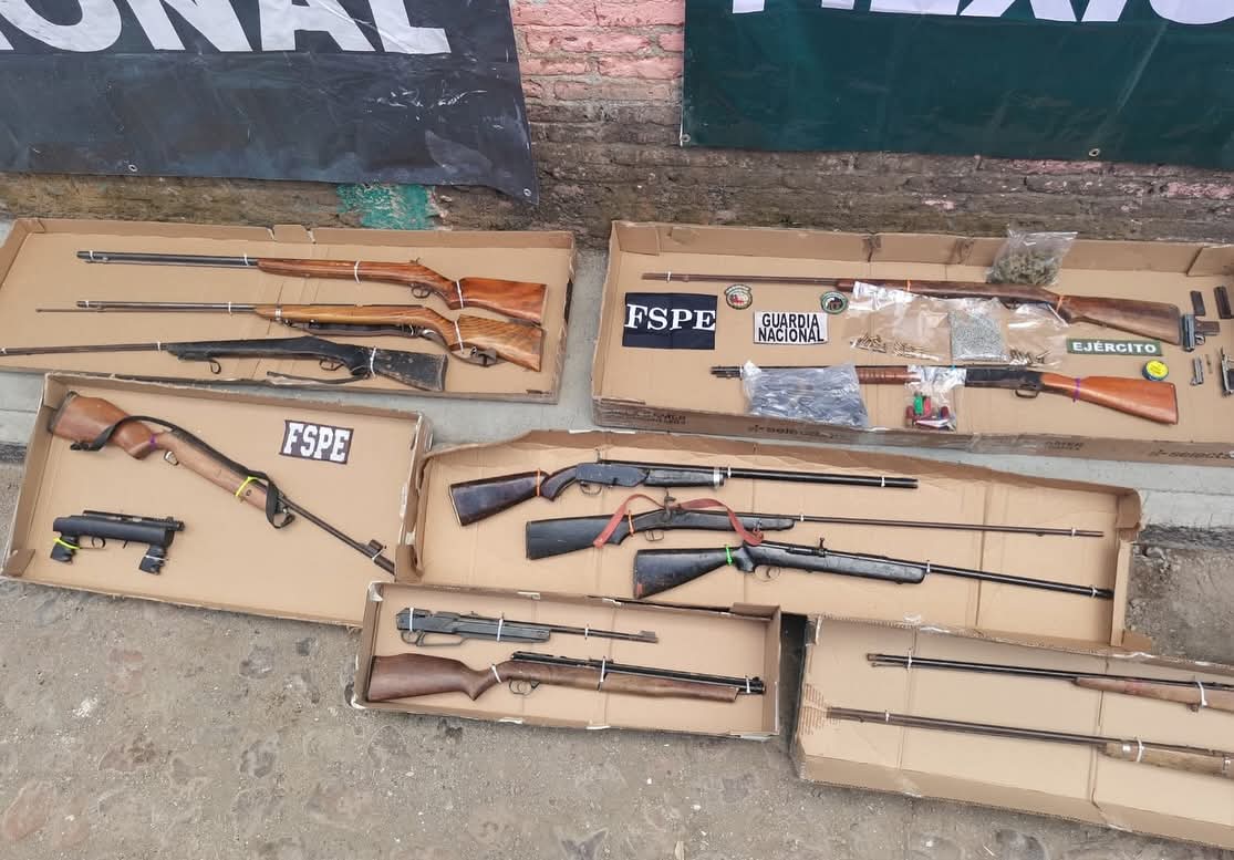 Como resultado del operativo fueron asegurados un arma de fuego de fabricación artesanal; 12 armas largas tipo escopeta artesanal; una pistola calibre .22; una caja de mecanismo con número de serie 4011606; más de 50 cartuchos de distintos calibres y 2 cargadores metálicos para calibre .22.