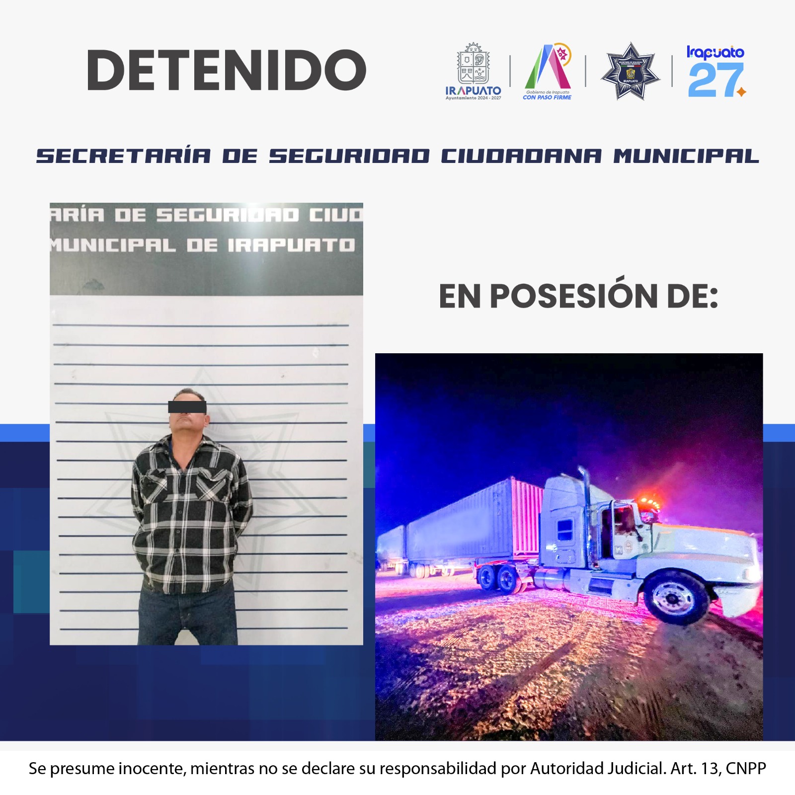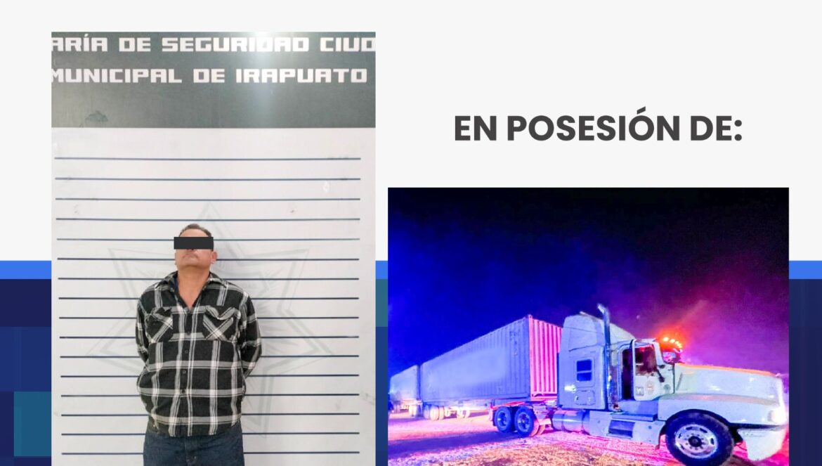 Irapuato, Gto. (22/10/2025).- Integrantes de la Secretaría de Seguridad Ciudadana Municipal de Irapuato aseguraron un tracto camión con reporte de robo y detuvieron a un sujeto identificado como Rigoberto, de 46 años de edad, quien conducía la unidad.