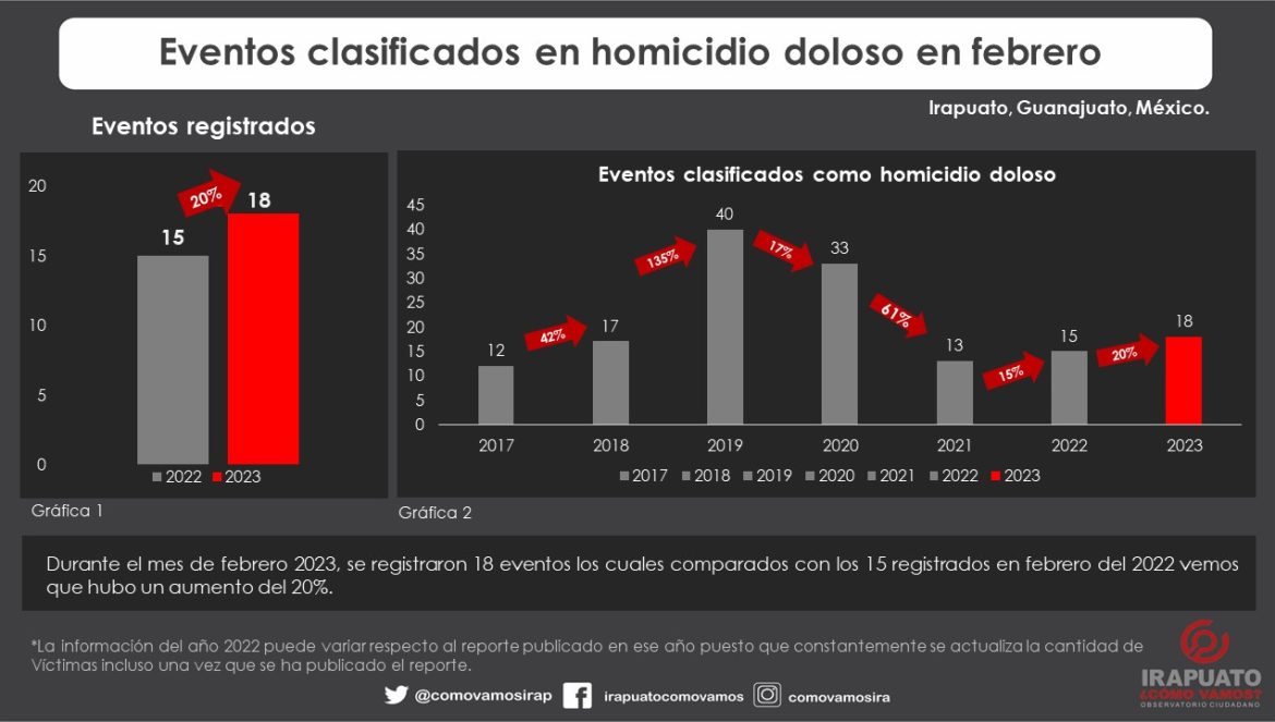 Irapuato, Gto. (6/marzo/2023).- Un total de 20 personas fueron asesinadas en el municipio, durante el mes de febrero, de acuerdo al reporte mensual de víctimas por homicidio doloso del Observatorio Ciudadano Irapuato Cómo Vamos.
