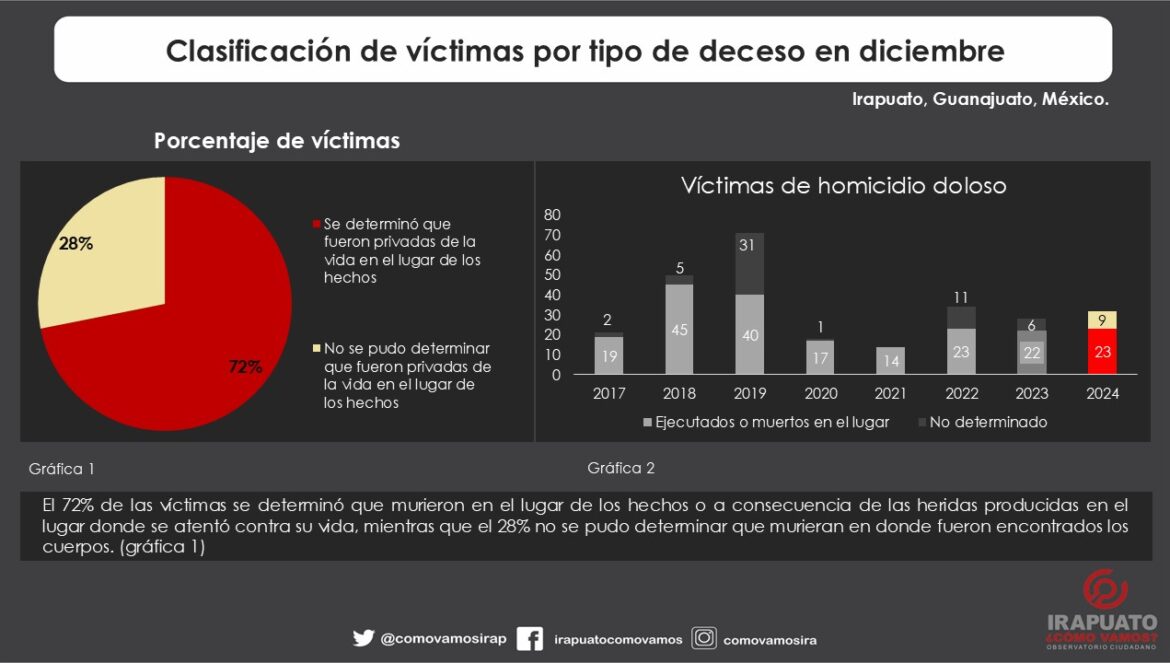 Irapuato, Gto. (6/1/2025).- Un total de 32 personas fueron asesinadas durante el mes de diciembre del 2024, de acuerdo al reporte mensual de víctimas por homicidio doloso, realizado por el Observatorio Ciudadano Irapuato ¿cómo vamos?.
