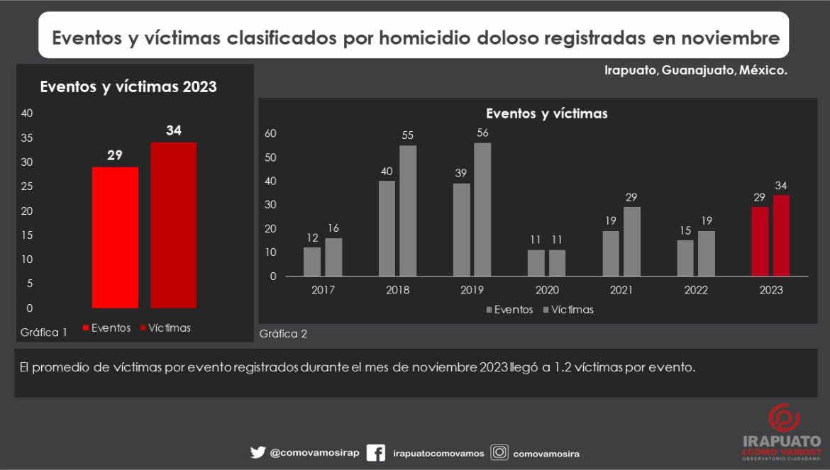 Irapuato, Gto. (4/12/2023).- Un total de 34 personas fueron asesinadas durante el mes de noviembre en distintos puntos del municipio, de acuerdo al reporte mensual de víctimas por homicidio doloso del Observatorio Ciudadano Irapuato Cómo Vamos.