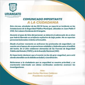 «Durante el pase de lista del personal, se detectó el sobrevuelo de un dron que habría liberado un artefacto explosivo de bajo poder. No se reportan personas lesionadas ni daños al inmueble…. Es importante destacar que el evento no fue de gran magnitud, pero está siendo atendido con la debida seriedad y coordinación.», señaló el presidente municipal.