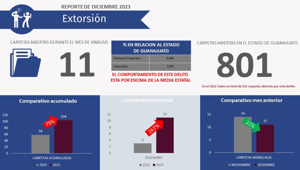 Respecto a la extorsión, durante el mes de diciembre 2023 se registró un total de 11 carpetas por este delito que comparadas con el mes de diciembre 2022 registró aumento en carpetas de 267% y en el comparativo acumulado considerando las cifras del 2023 contra el mismo periodo, pero del 2022 se observa un aumento del 79%.