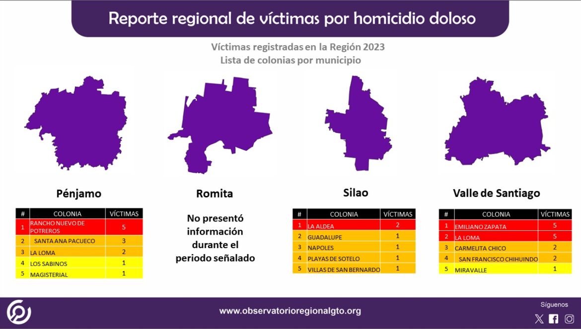 Así bien, de las 118 víctimas en la región, Irapuato registro el 57.6%, Valle de Santiago 17%, Pénjamo 14.4%, Silao 5.1%, Jaral del Progreso 1.7%, y Abasolo 4.2%. Los municipios de Cuerámaro y Romita no registraron víctimas.