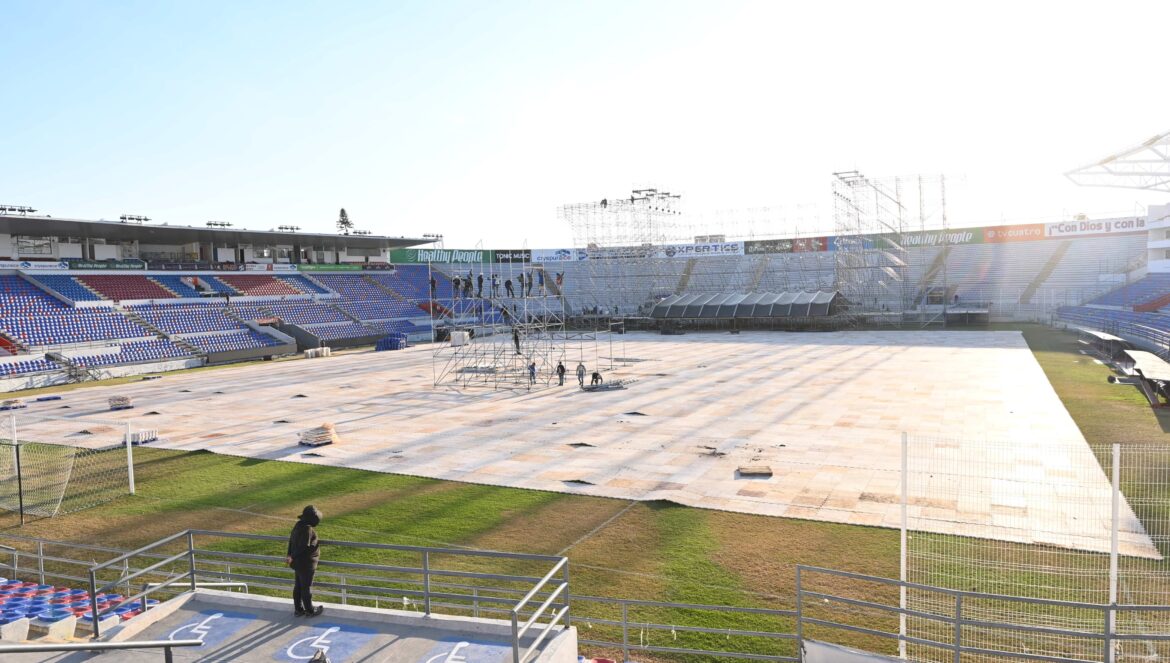 Irapuato, Gto. 04 de diciembre 2024.- El montaje del escenario donde se presentará Luis Miguel en el estadio Sergio León Chávez marcha en tiempo y forma, solo falta la instalación de pantallas y parte del audio, así lo informó el representante de Music Vive, Mario Durán, empresa involucrada en la promoción del concierto.