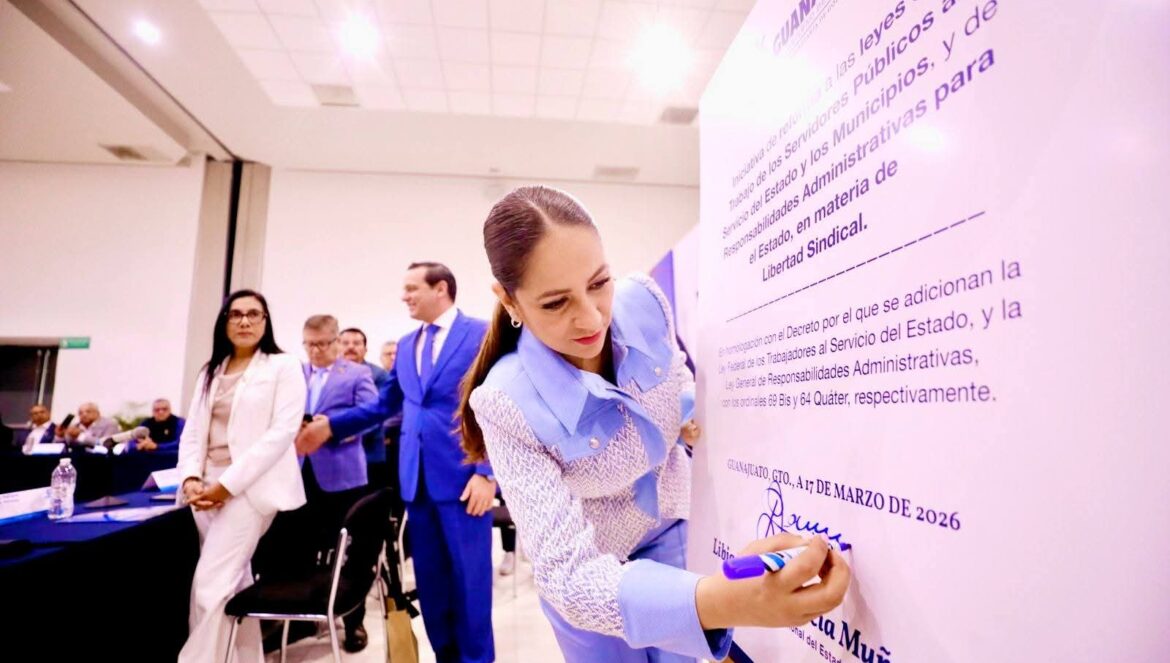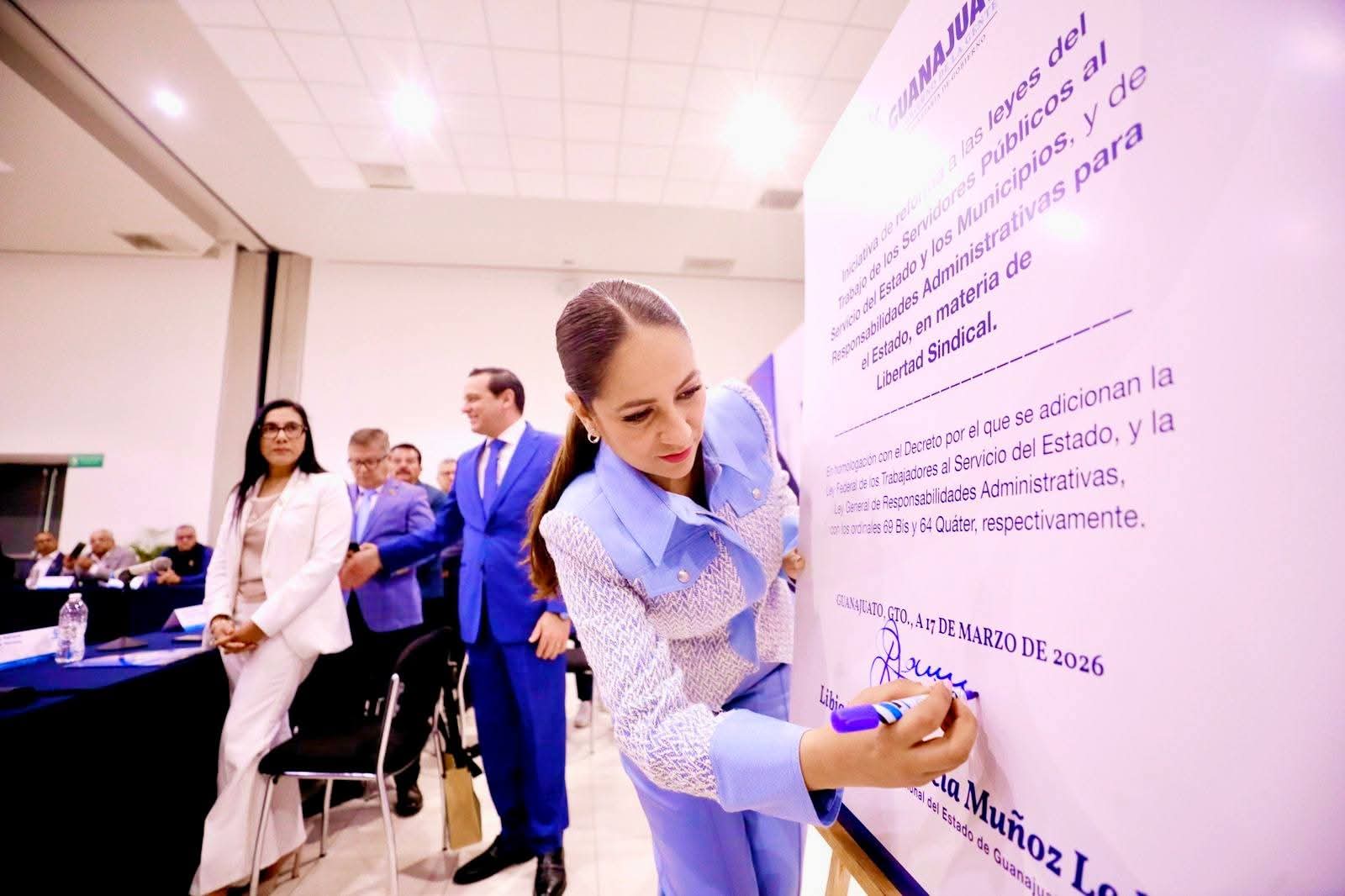 Gto. (18/3/2026).- La Gobernadora de la Gente, Libia Dennise García Muñoz Ledo, firmó la iniciativa de reforma que será enviada al Congreso del Estado con el objetivo de garantizar plenamente la libertad sindical y fortalecer la vida democrática en el ámbito laboral, en un hecho respaldado por representantes de sindicatos de los tres órdenes de gobierno.