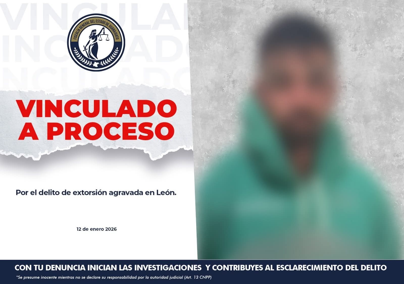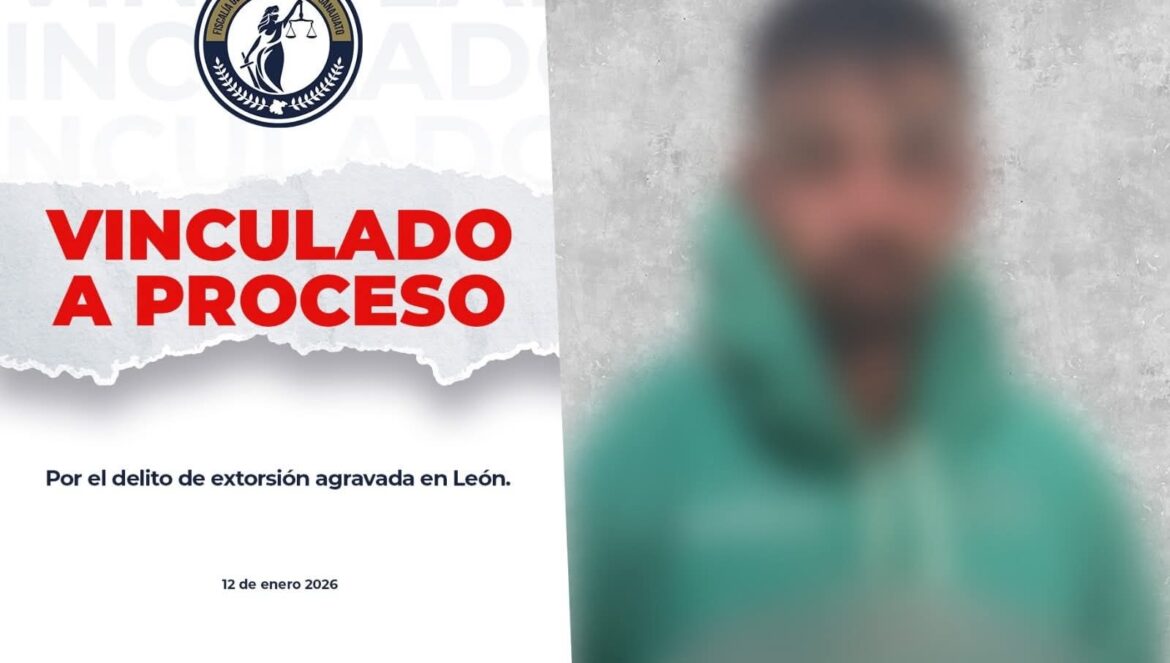 León, Gto. (13/1/2026).- La Fiscalía General del Estado de Guanajuato informa que un hombre llamado Miguel Ángel, ha sido enviado a prisión y enfrentará un proceso penal tras ser capturado por el delito de extorsión agravada, en diciembre del 2025.