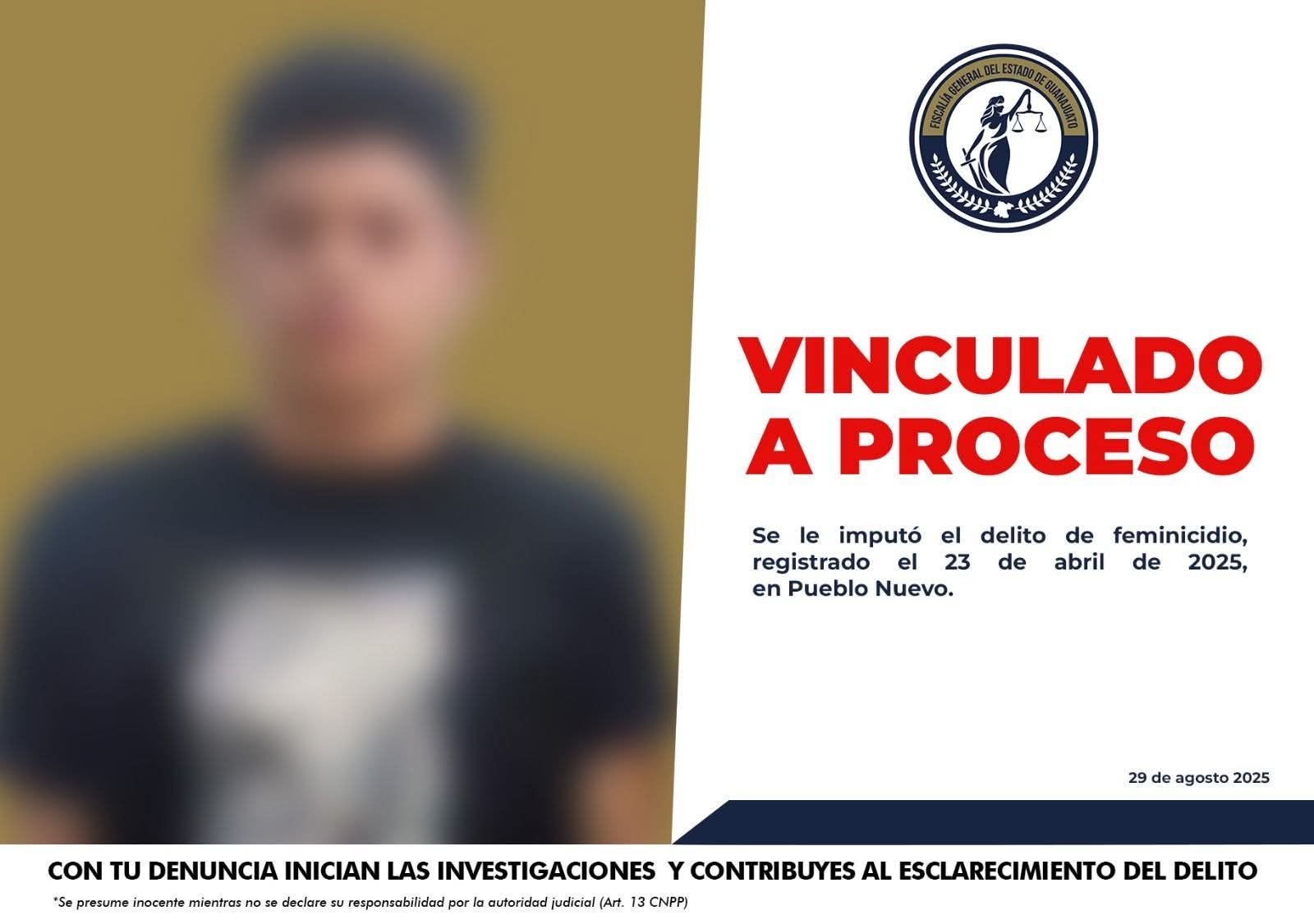Pueblo Nuevo, Gto. (1/9/2025).- La Fiscalía General del Estado capturó a Ángel Abraham, alias “El Michoacano”, como presunto responsable del delito de feminicidio. Un juez lo vinculó a proceso penal por el crimen de una víctima cometido en la zona centro de la ciudad de Pueblo Nuevo.