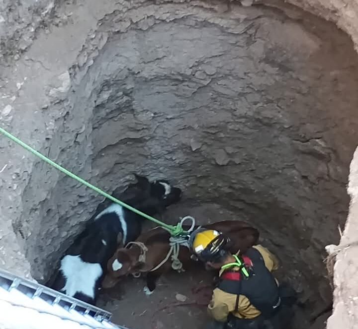 Guanajuato. (12/2/2025).-Dos terneros que cayeron a un pozo de aproximadamente 8 metros de profundidad, fueron rescatados por la Policía Ambiental en coordinación con el Cuerpo de Bomberos Guanajuato, en la comunidad de Puentecillas.