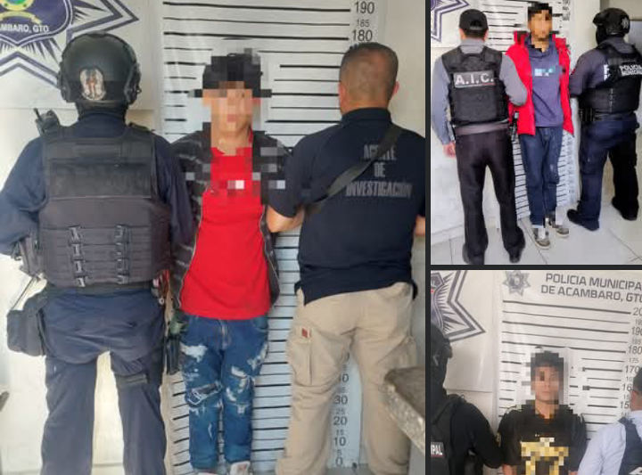 Acámbaro, Gto. (9/02/2026).- Policías Municipales, en coordinación con Agentes de Investigación Criminal de la Fiscalía General del Estado, realizaron el aseguramiento de 3 hombres, quienes de acuerdo a las investigaciones, presuntamente están relacionados a crímenes violentos en los últimos 3 meses en el municipio de Acámbaro.