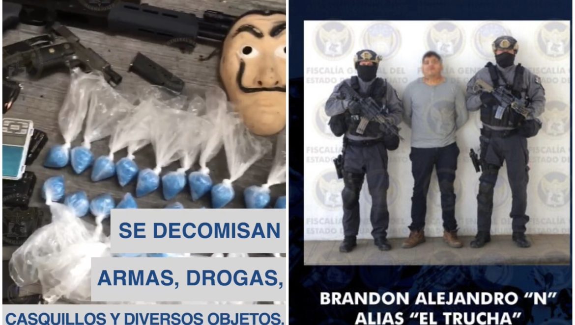 Guanajuato, Gto., 22 de enero de 2023.- La Fiscalía General del Estado coordinó acciones con el Ejército Mexicano, Guardia Nacional y la Secretaría de Seguridad Pública del Estado para capturar a BRANDON ALEJANDRO “N”, un sujeto de 26 años, apodado “El Trucha” asesino serial y líder de una banda dedicada al secuestro, la extorsión y otros crímenes. También capturaron a seis personas más integrantes de su célula criminal.