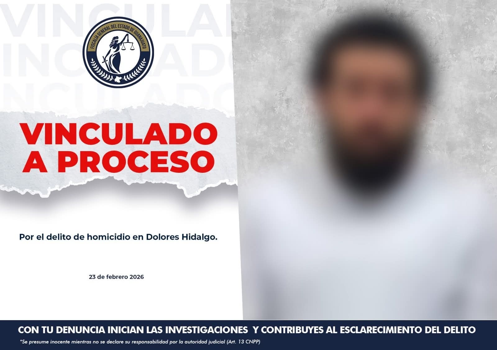Dolores Hidalgo, Gto. (23/2/2026).- La Fiscalía General del Estado de Guanajuato en colaboración con la Secretaría Pública Municipal, logró la detención y vinculación a proceso penal de José, alias “el wero menfis”, por su probable responsabilidad en el delito de homicidio calificado, derivado de hechos criminales ocurridos en Dolores Hidalgo.