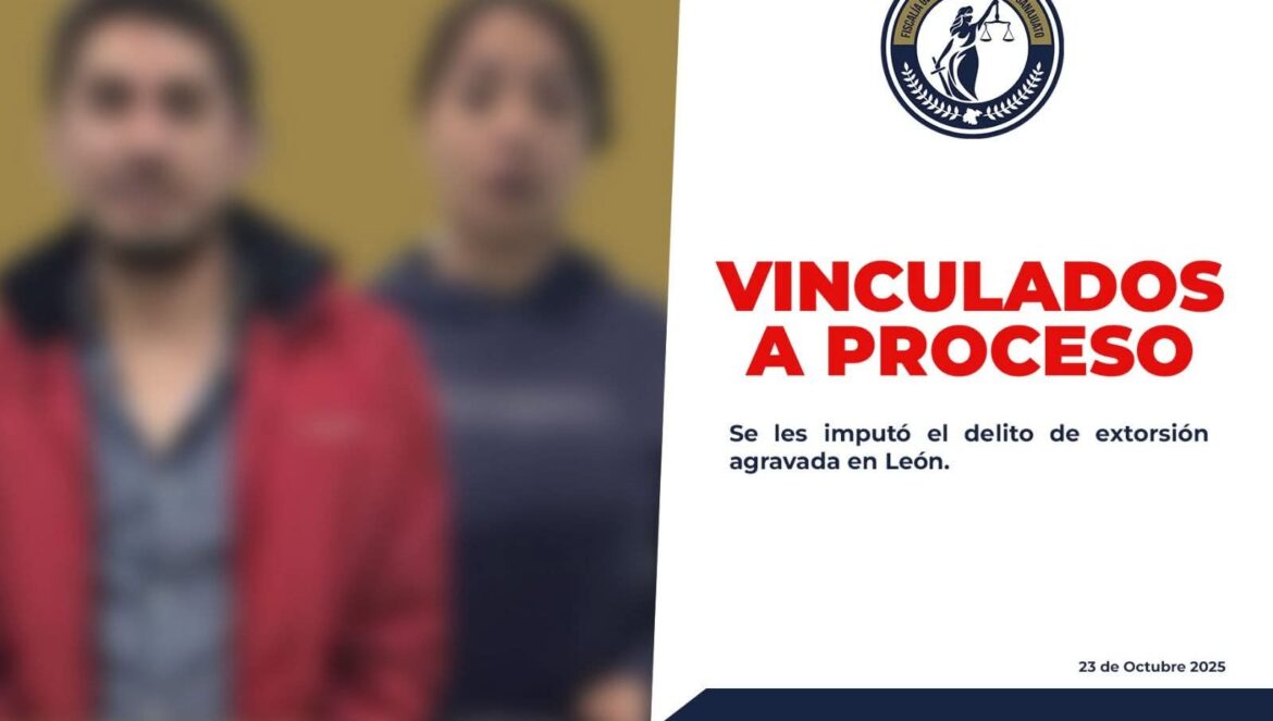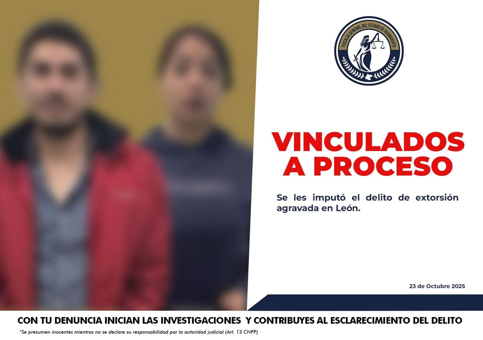 Gto. (23/10/2025).- La Fiscalía General del Estado, a través de la Fiscalía Especializada en Delitos de Alto Impacto, logró la vinculación a proceso de Sergio Eduardo y Diana Ivonne, detenidos por su presunta responsabilidad en el delito de extorsión agravada en León.
