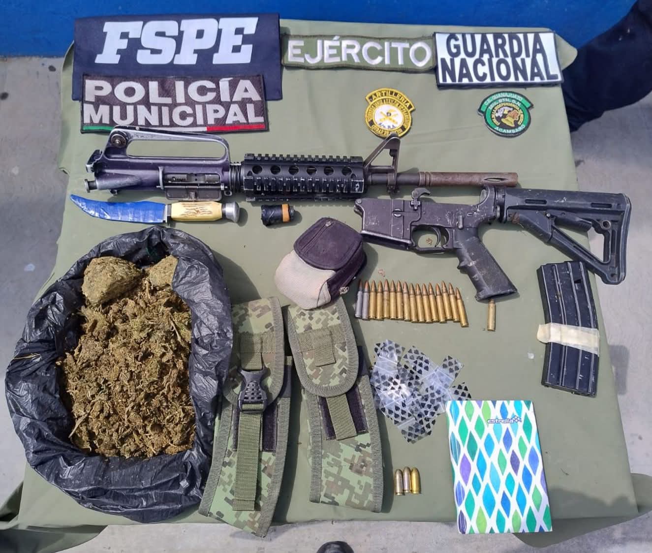 Un Fusil AR-15 calibre 5.56 mm., un cargador metálico para fusil AR-15, 17 cartuchos útiles calibre 5.56 mm, 3 cartuchos útiles calibre 9 mm, además de dos cartucheras de color verde pixelado.
