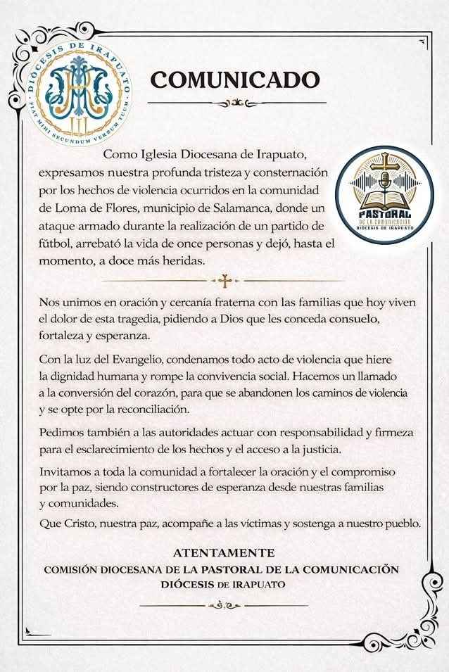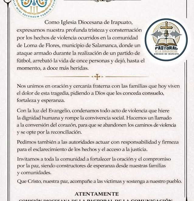 «Como Iglesia Diocesana de Irapuato, expresamos nuestra profunda tristeza y consternación por los hechos de violencia ocurridos en la comunidad de Loma de Flores, municipio de Salamanca, donde un ataque armado durante la realización de un partido de fütbol, arrebató la vida de once personas y dejó, hasta el momento, a doce más heridas», señala la Diócesis.