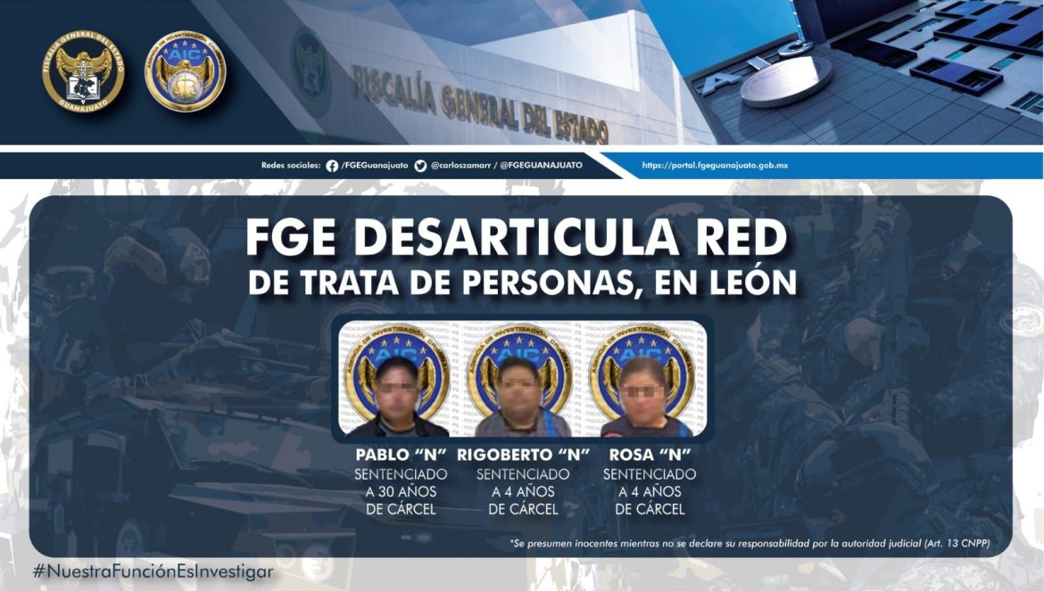 León, Gto., 26 de enero de 2023.- La Unidad Especializada en Combate a la Trata de Personas y Corrupción de Menores (UECOT), de la FGEG, desarticuló una red de trata de personas que operaba en León y era dirigida desde Puebla. Dos hombres y una mujer que explotaban sexualmente a dos víctimas fueron detenidos y sentenciados a prisión.