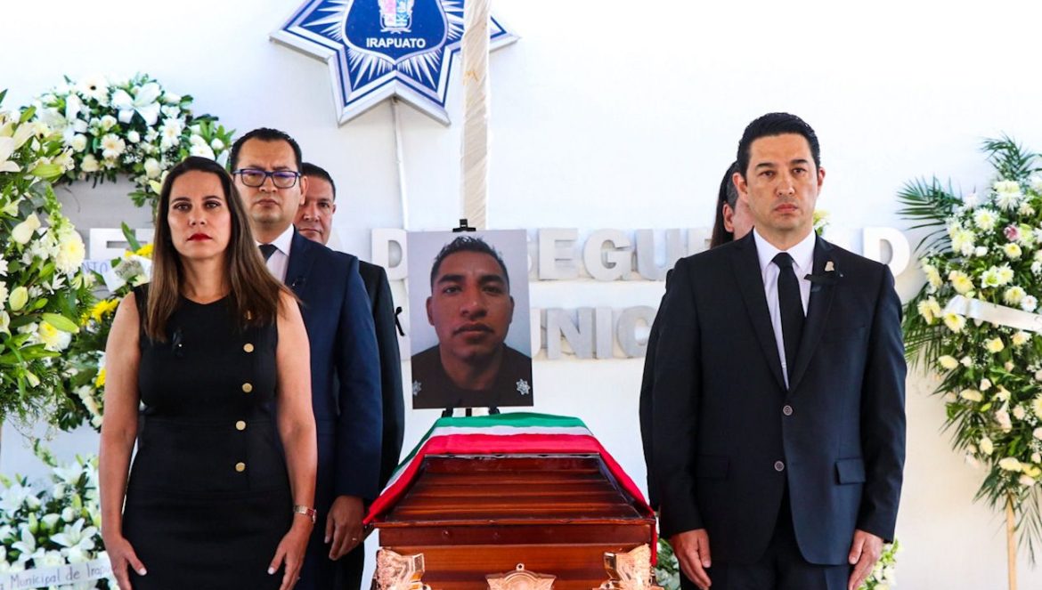 Irapuato, Gto. (30/mayo/2023).- Con una guardia de honor, autoridades municipales, encabezadas por la Alcaldesa Lorena Alfaro y el secretario de Seguridad Ciudadana, Ricardo Benavides, despidieron al policía Rodolfo Hernández Martínez, quien falleció en cumplimiento de su deber.