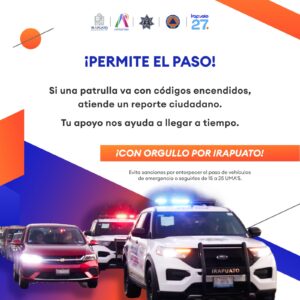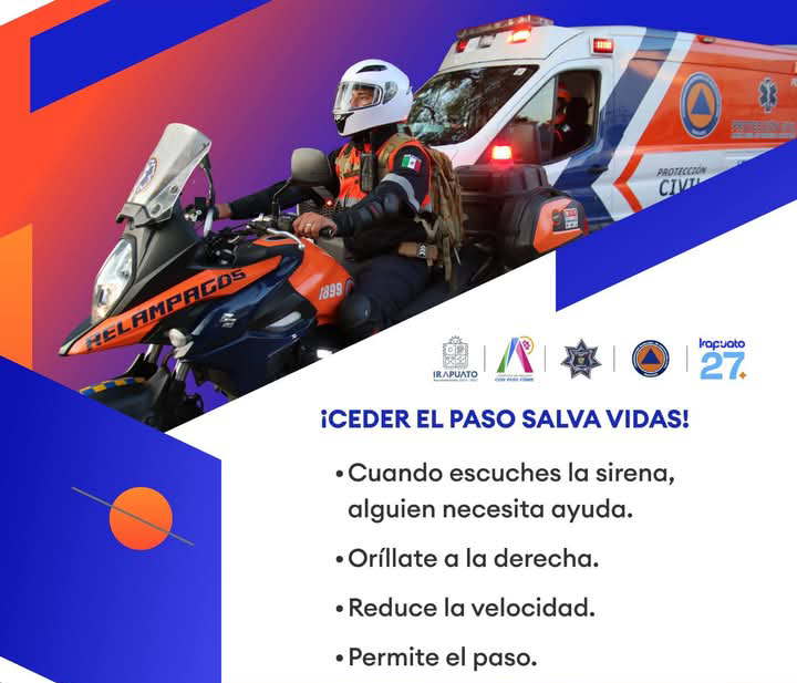 Irapuato, Gto. (16/2/2026).- A fin de agilizar la atención de reportes de seguridad y emergencias, la Secretaría de Seguridad Ciudadana Municipal exhorta a la población a respetar en todo momento el paso de los vehículos de auxilio cuando circulen con códigos sonoros y luminosos.