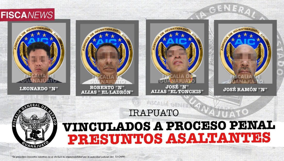 Irapuato, Gto.- 24 de agosto de 2023.- La Fiscalía de Guanajuato obtuvo que cuatro presuntos atracadores sean vinculados a proceso penal por el delito de robo calificado, uno de ellos es acusado de desapoderar a un hombre de su vehículo y los otros tres inculpados, presuntamente despojaron a un cuentahabiente de la nómina de una empresa, que recién había retirado del banco, ambos delitos se cometieron en la ciudad de Irapuato.