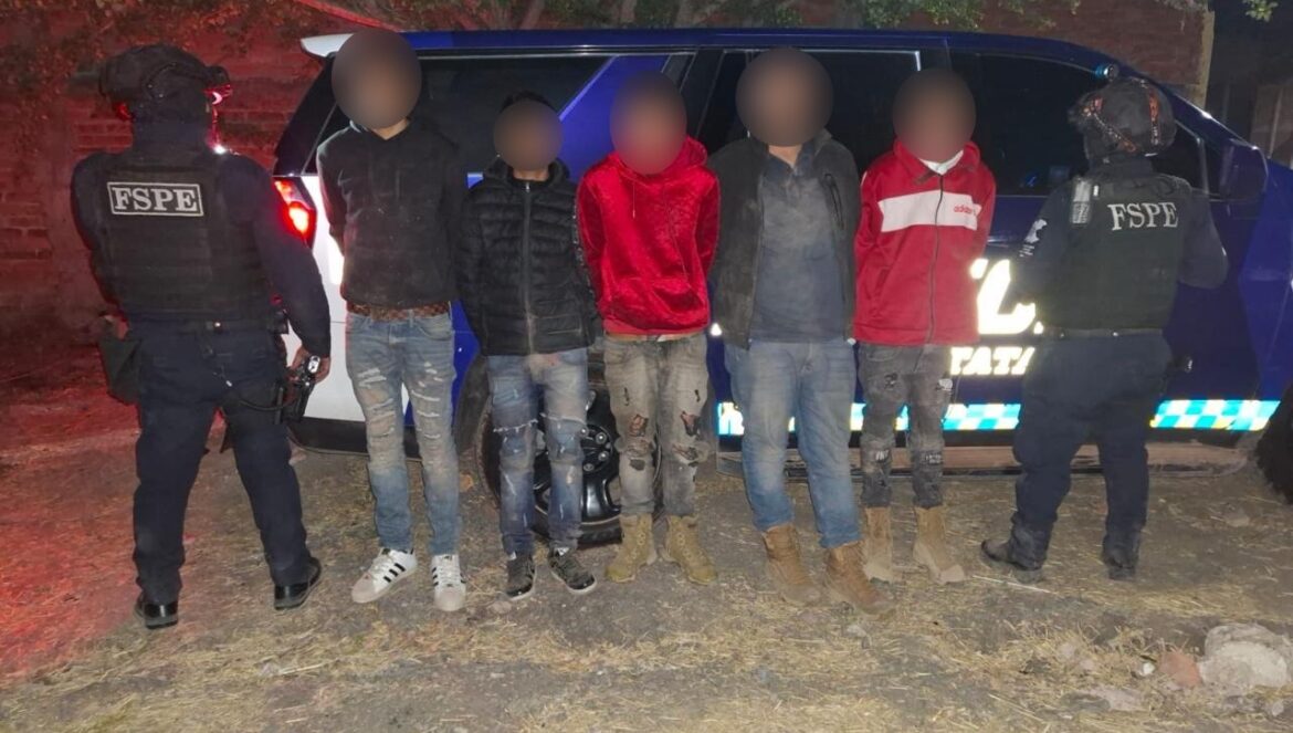 Durante la inspección, se detuvo a 5 individuos originarios del estado de Jalisco, entre ellos 3 menores de edad, identificados como Julián, de 20 años, Jorge, de 18, quien portaba un arma corta calibre 4.5 mm. y 3 menores de nombres: Johan de 15 años, Ángel y Michael, ambos de 14 años de edad.