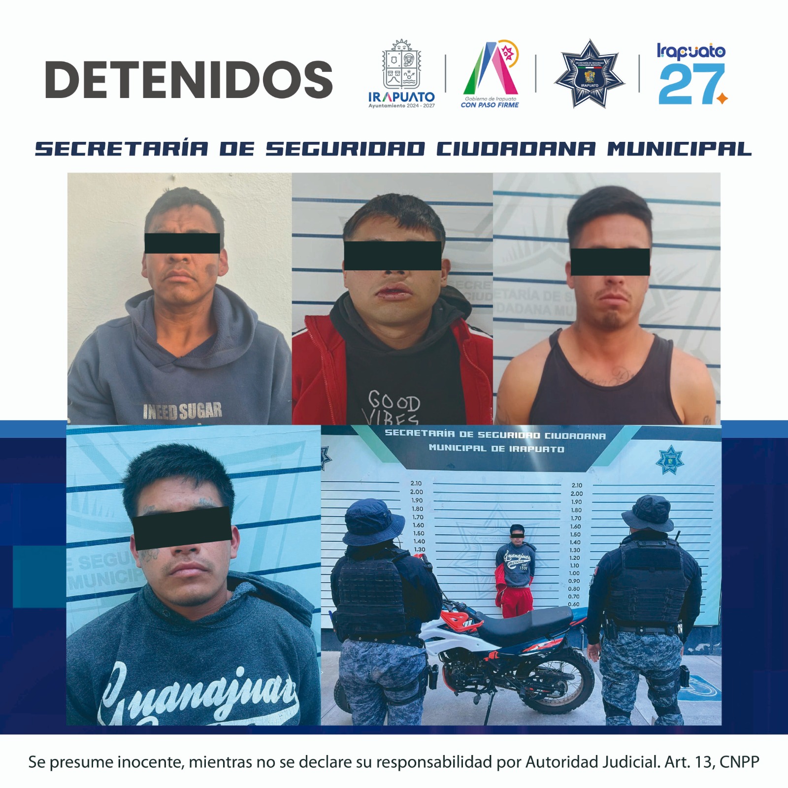 Irapuato, Gto. (19/1/2026).– Como parte de las acciones permanentes de prevención y del combate a los delitos contra la salud, la Secretaría de Seguridad Ciudadana Municipal, logró en diferentes acciones la detención de siete individuos en posesión de 27 envoltorios de presunta droga conocida como cristal y mariguana