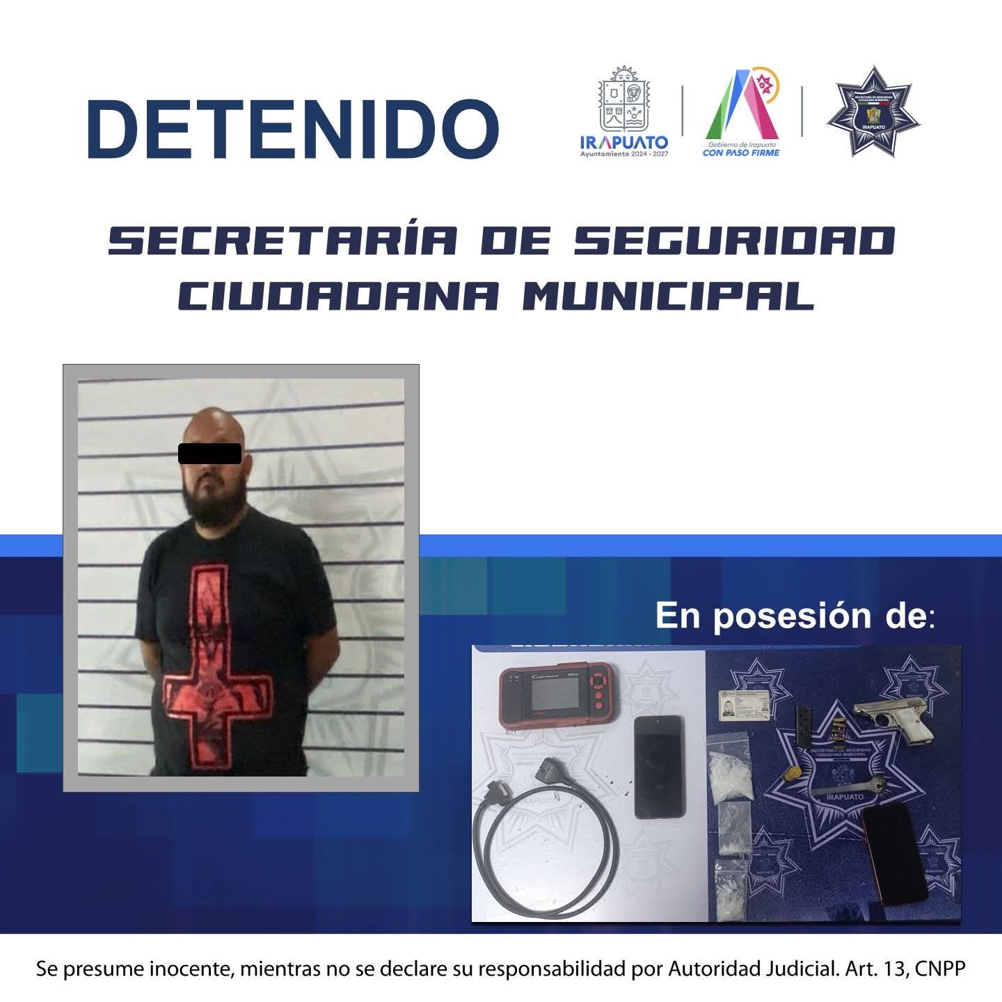 Para detectar y mitigar cualquier fuente de riesgo para la población y para sus propios compañeros, policías municipales practicaron una revisión preventiva al vehículo, donde localizaron un arma de fuego calibre 25 milímetros, así como envoltorios que contenían presunta droga, con características del cristal.
