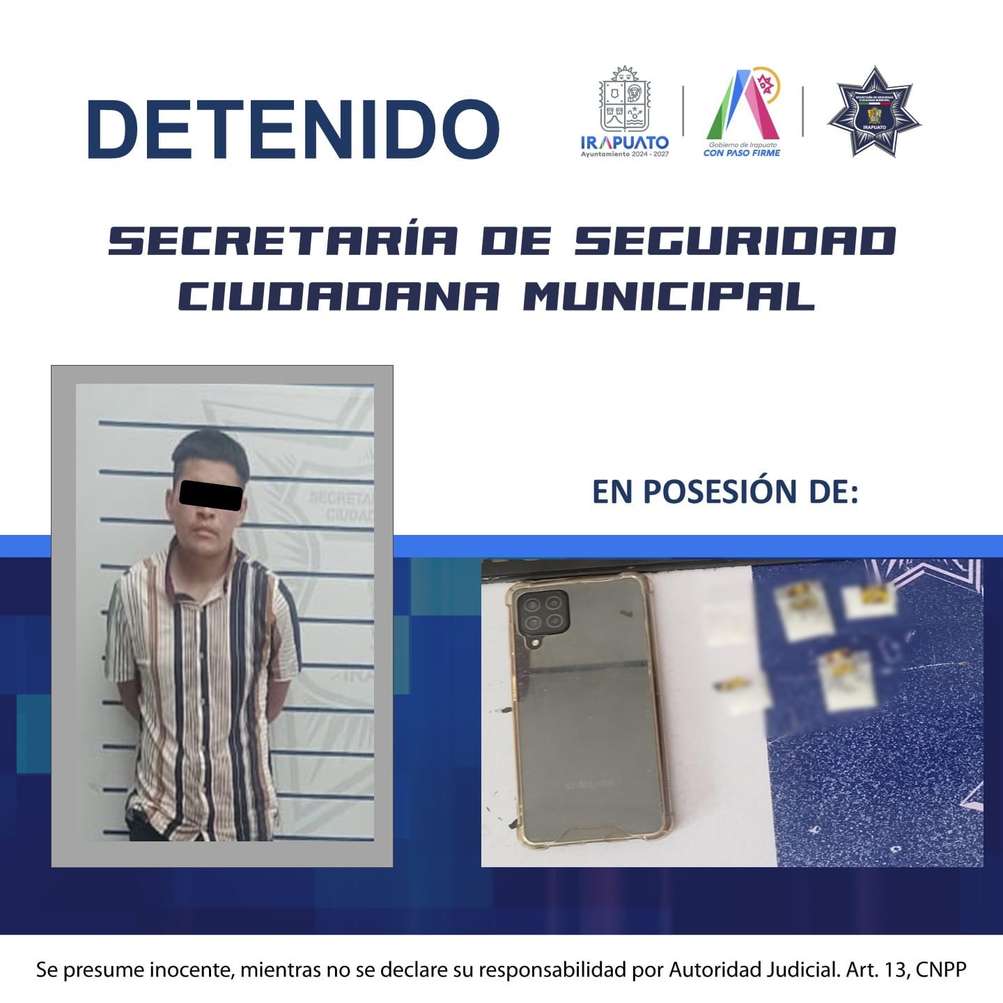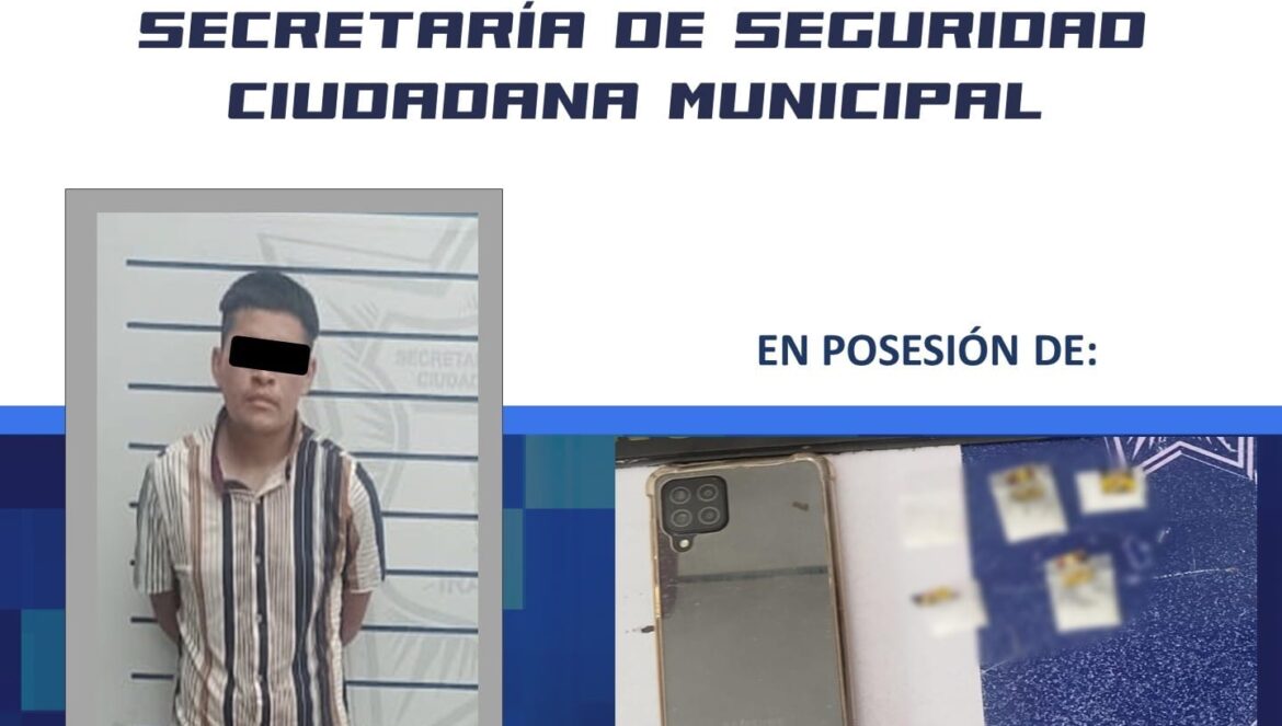 Irapuato, Gto. (9/10/2025).- En recorridos de prevención y vigilancia que efectúa la Secretaría de Seguridad Ciudadana de Irapuato en los diferentes sectores del municipio, policías municipales detuvieron a un joven que entre sus pertenencias tenía ocultos envoltorios que contenían en su interior presunta droga conocida como cristal.