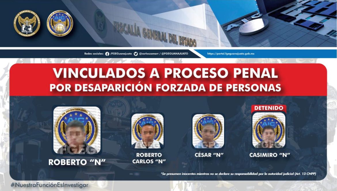 Romita, Gto. 06 de marzo de 2023.- Con elementos de prueba, la FGE obtuvo vinculación a proceso penal en contra de ROBERTO “N”, ex mando policiaco de la dirección de Seguridad Pública y Vialidad de Romita, de ROBERTO CARLOS “N” y de CÉSAR “N”, ex elementos de la corporación, por el delito de desaparición forzada de personas en agravio de Juan Pablo, Carlos Esteban y Daniela.