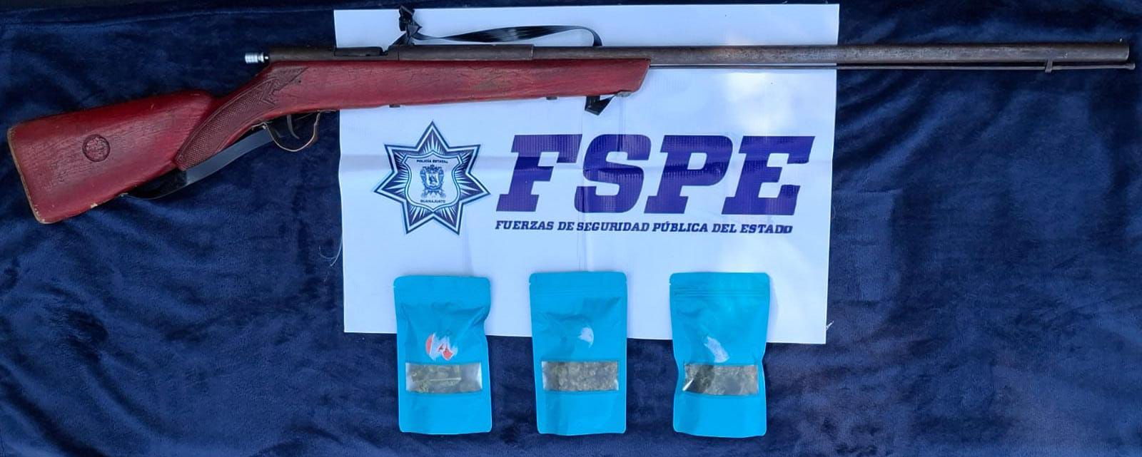 Yuriria, Gto. (6/11/2025).- La Secretaría de Seguridad y Paz, a través de las Fuerzas de Seguridad Pública del Estado (FSPE) detuvo a una persona en posesión de 96 dosis de droga con características de marihuana así como un arma artesanal.