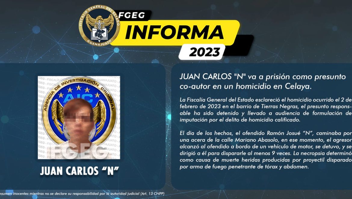 Celaya, Gto. (20/marzo/2023).- La Fiscalía General del Estado esclareció el homicidio ocurrido el 2 de febrero de 2023 en el barrio de Tierras Negras, el presunto responsable ha sido detenido y llevado a audiencia de formulación de imputación por el delito de homicidio calificado.