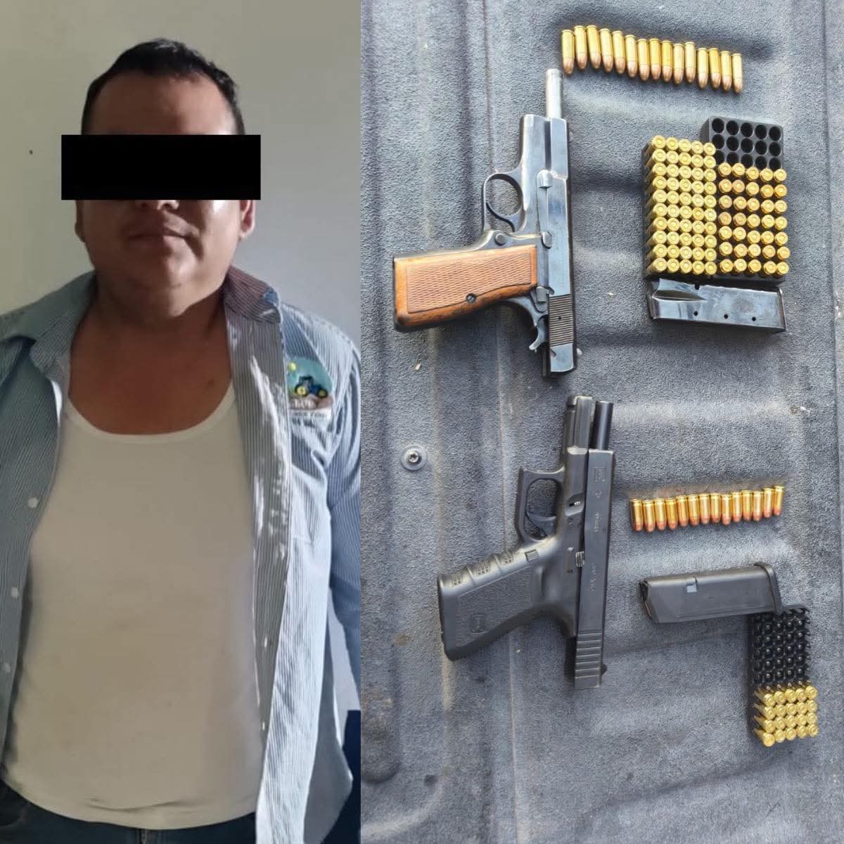 En la camioneta que conducía se aseguraron: 2 armas de fuego cortas, más de 100 cartuchos útiles de distintos calibres y un vehículo Mitsubishi L200 gris oscuro.