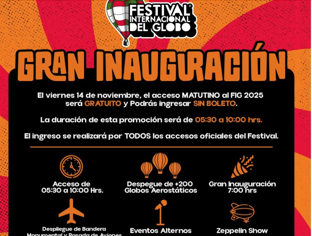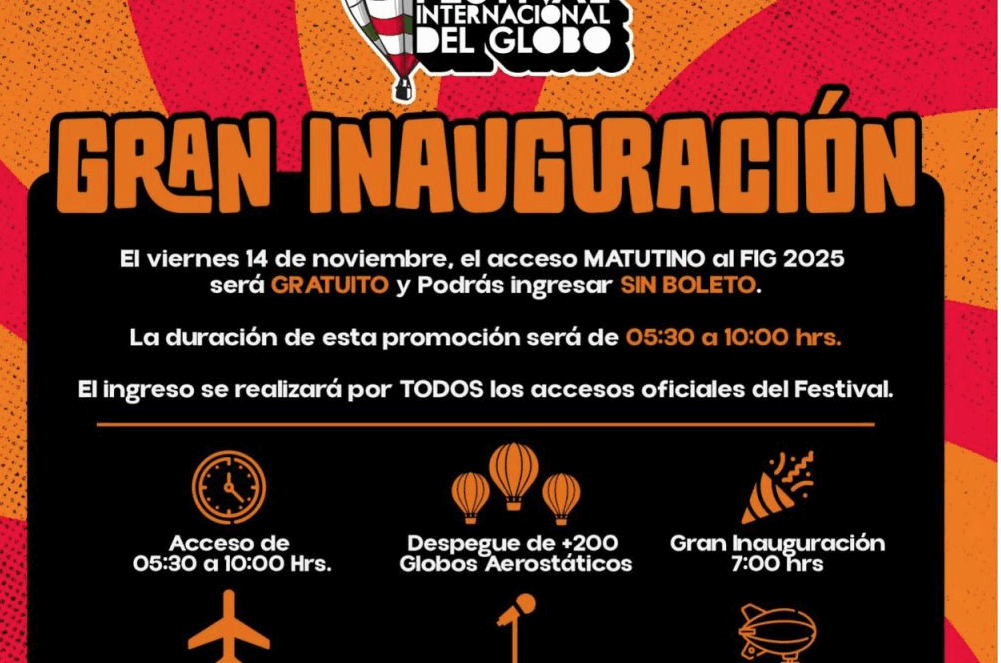 La iniciativa busca que nadie se quede fuera de uno de los festivales más esperados del país. “Viernes de la Gente” es una invitación a las y los leoneses para vivir la experiencia completa del FIG por la mañana sin costo, disfrutando los primeros despegues de globos aerostáticos, por la noche el acceso con costo será para el show inaugural de Gloria Trevi.