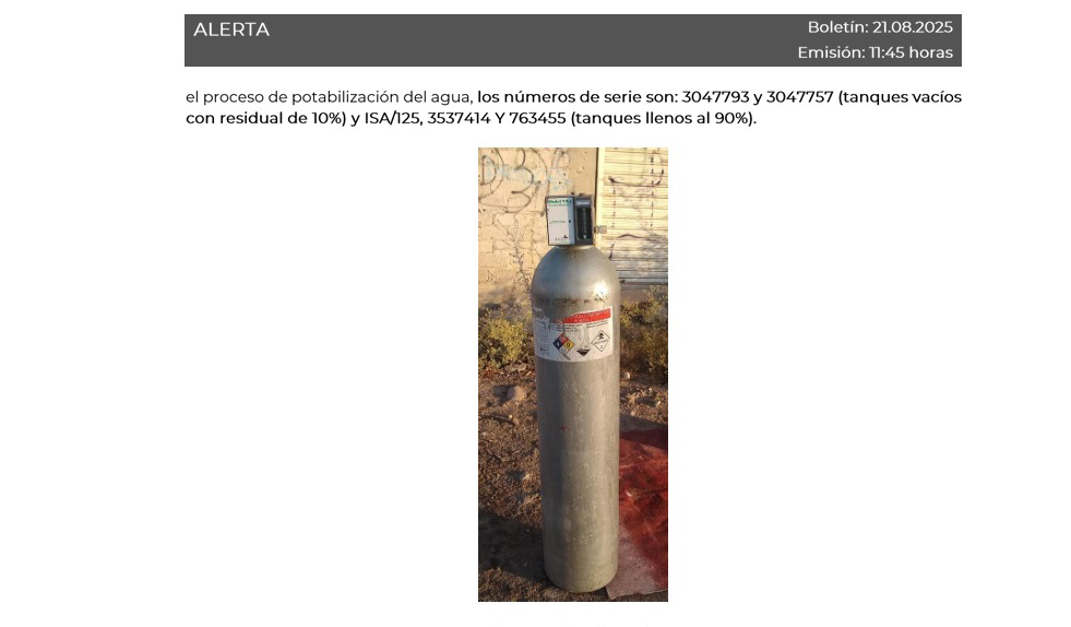 Guanajuato, Gto., a 22 de agosto de 2025.- La Coordinación Nacional de Protección Civil (CNPC) de la Secretaría de Seguridad y Protección Ciudadana emitió una alerta a Protección Civil de Guanajuato, Querétaro, San Luis Potosí, Hidalgo, Michoacán y Estado de México, tras el robo de cinco cilindros con gas cloro propiedad de la Comisión Estatal de Aguas de Querétaro (CEA).