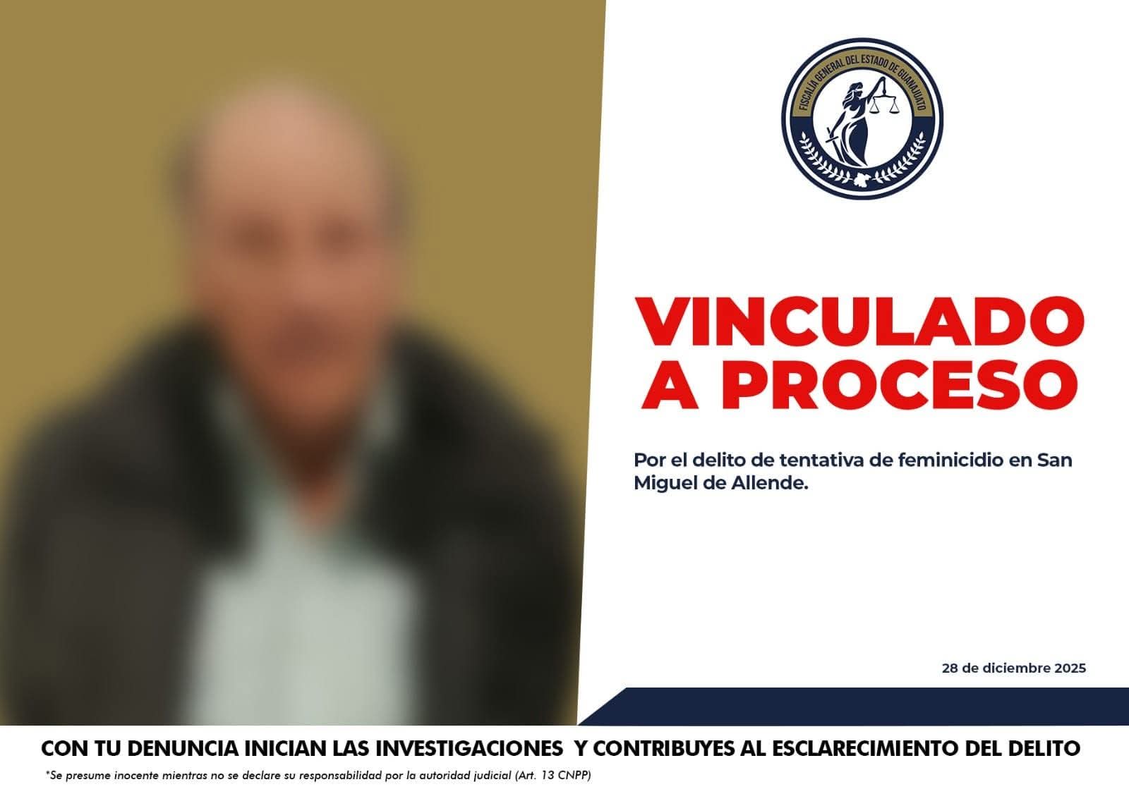Gto. (29/12/2025).- La Fiscalía General del Estado de Guanajuato ha logrado la vinculación a proceso de Gerardo, como presunto responsable del delito de feminicidio en grado de tentativa, tras los hechos violentos registrados este 25 de diciembre en la comunidad Puente del Carmen, en San Miguel de Allende.