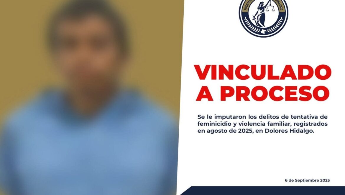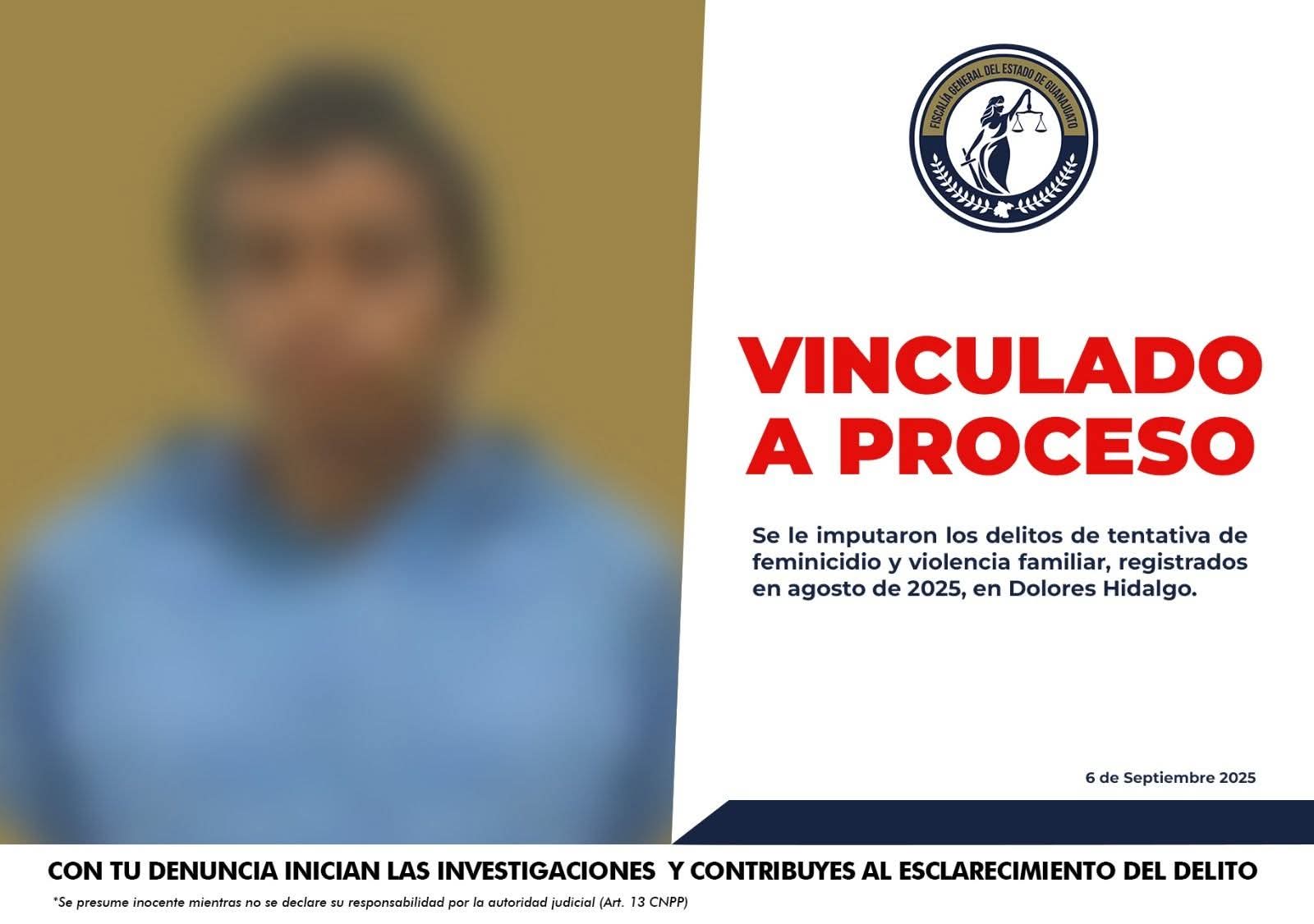 Dolores Hidalgo, Gto. (8/9/2025).- La Fiscalía General del Estado de Guanajuato consiguió que un sujeto identificado como Eduardo, fuera vinculado a proceso penal por los delitos de tentativa de feminicidio y violencia familiar.