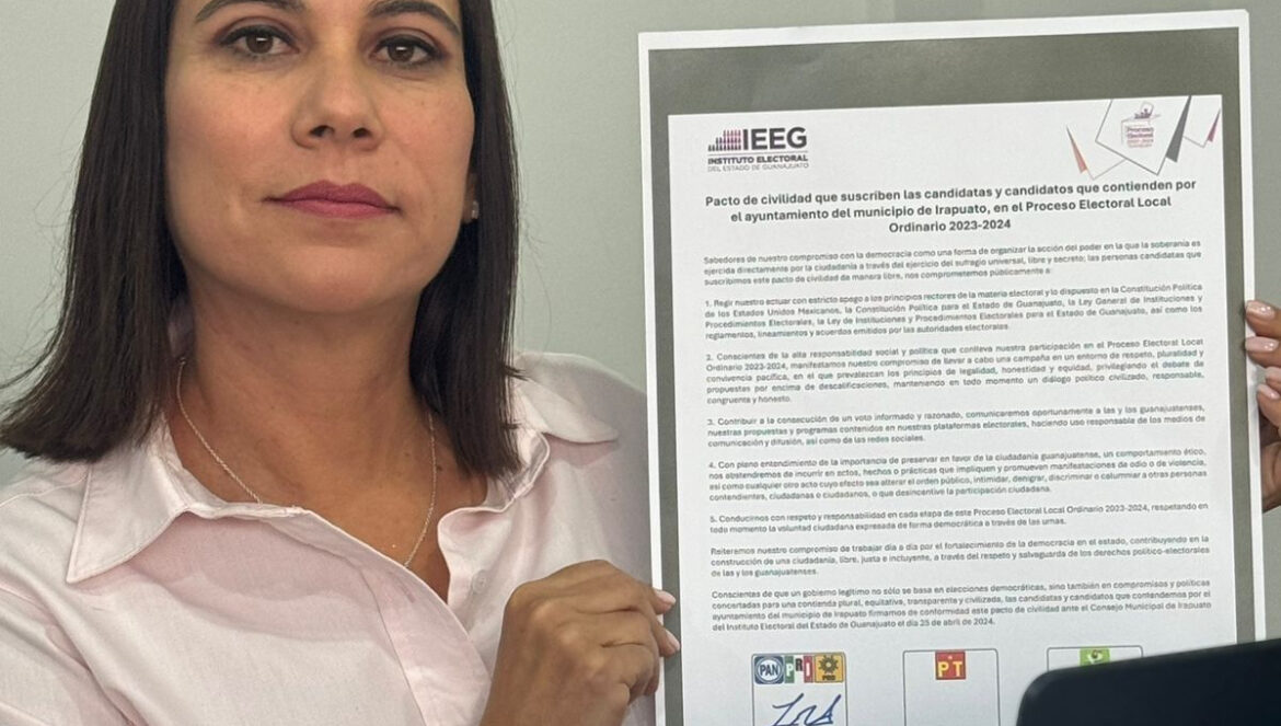 Irapuato, Guanajuato. 25 de abril del 2024.- Para contribuir a lograr un ambiente de respeto, diálogo y tolerancia entre las y los actores políticos durante el actual proceso electoral, Lorena Alfaro García, candidata a la Presidencia de Irapuato por la Coalición Fuerza y Corazón por Guanajuato, firmó el Pacto de Civilidad Política del Instituto Electoral del Estado de Guanajuato (IEEG).