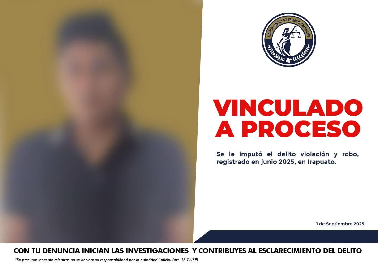 Irapuato, Gto. (1/9/2025).- La Fiscalía General del Estado, a través del Centro de Justicia para las Mujeres, esclareció un caso de violencia sexual y robo ocurrido en Irapuato, logrando que el responsable fuera vinculado a proceso penal y permanezca en prisión preventiva.