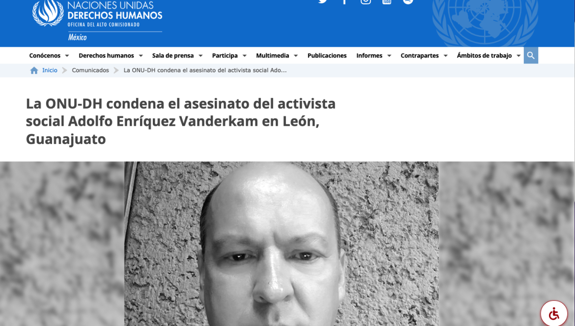 León, Gto.(23/11/2023).-La Organización de las Naciones Unidas se sumó al cúmulo de voces que han exigido el esclarecimiento del asesinato de Adolfo Enríquez Vanderkam y la inmediata detención de los responsables.