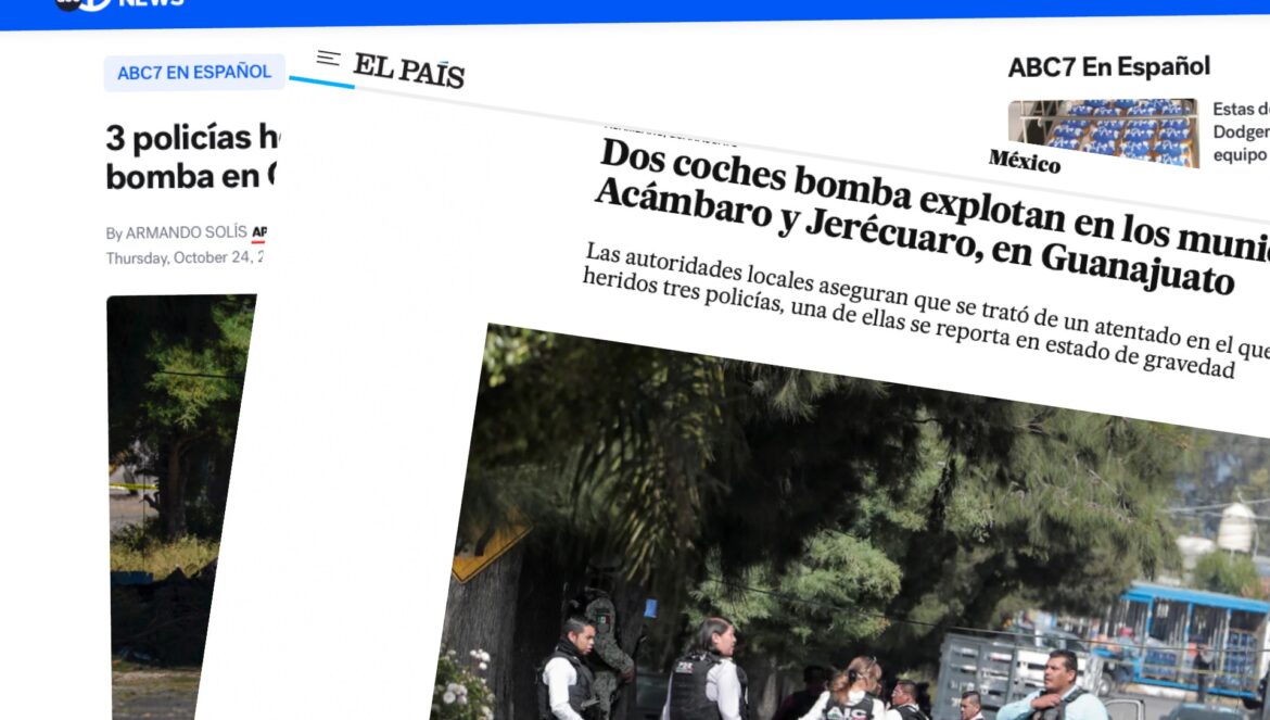 Guanajuato.(24/10/2024).-La explosión de dos autos bomba en los municipios de Acámbaro y Jerécuaro, frente a instalaciones de seguridad pública, y que dejaron como resultado tres policías lesionados y daños materiales aún no cuantificados, atraparon la atención de la prensa internacional.