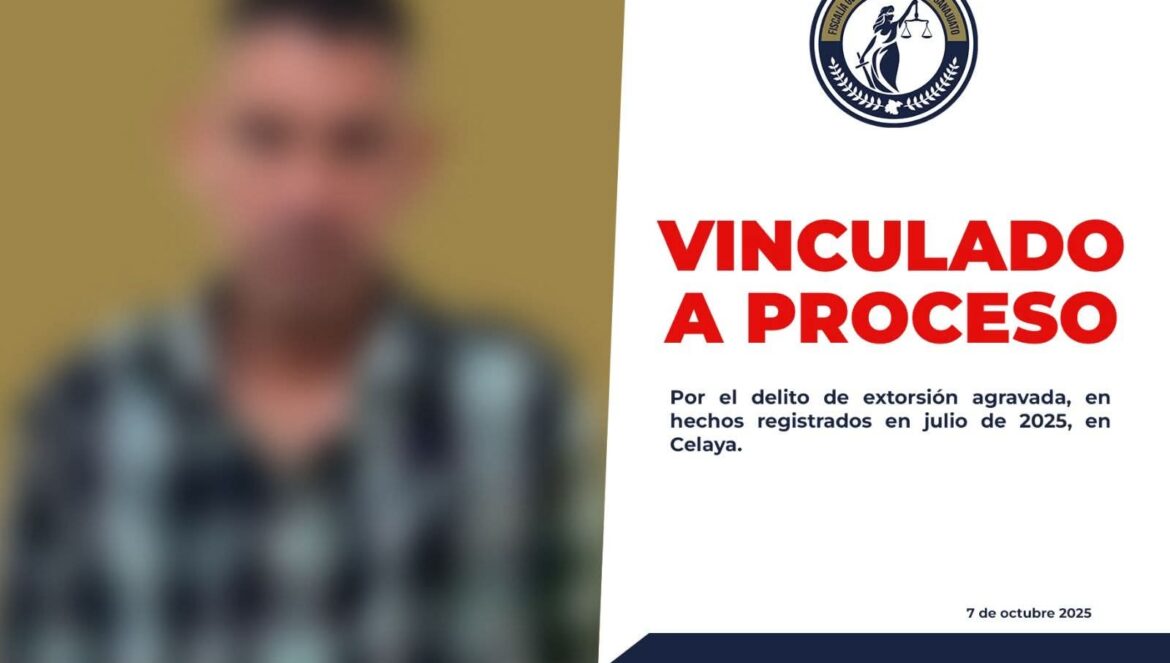 Celaya, Gto. (7/10/2025).- La Fiscalía General del Estado de Guanajuato, a través de la Unidad Especializada en Combate a la Extorsión, logró que un juez de control vincule a proceso a un sujeto identificado como Eduardo Dolores, por su probable responsabilidad en el delito de extorsión agravada, cometido en contra de una víctima en el mercado de abastos Benito Juárez, en Celaya.