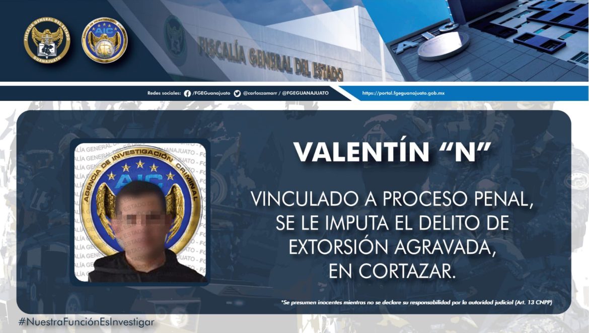 Cortazar, Gto. (27/enero/2023).- Un sujeto identificado como Valentín ya fue vinculado a proceso penal por el delito de extorsión agravada.