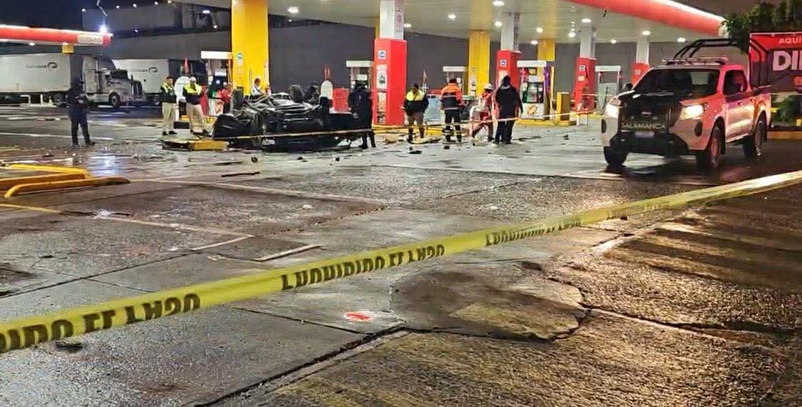 Salamanca, Gto. (16/6/2025).- Tres personas que viajaban a bordo de un vehículo, fallecieron tras sufrir un accidente en el que terminaron impactándose contra una de las bombas despachadores de gasolina, sobre la avenida Valle de Santiago, a la altura de la Central de Autobuses.